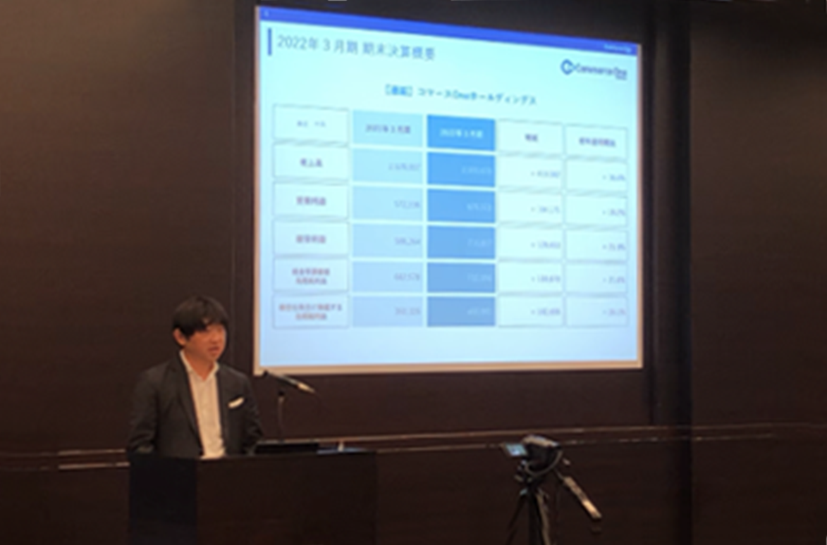 2022年5月20日(金)、国内機関投資家を対象に株式会社コマースOneホールディングスの2022年3月期決算説明会を開催し、代表取締役 岡本高彰が、2022年3月期の業績や2023年3月期以降の成長方針について約1時間にわたり述べました。