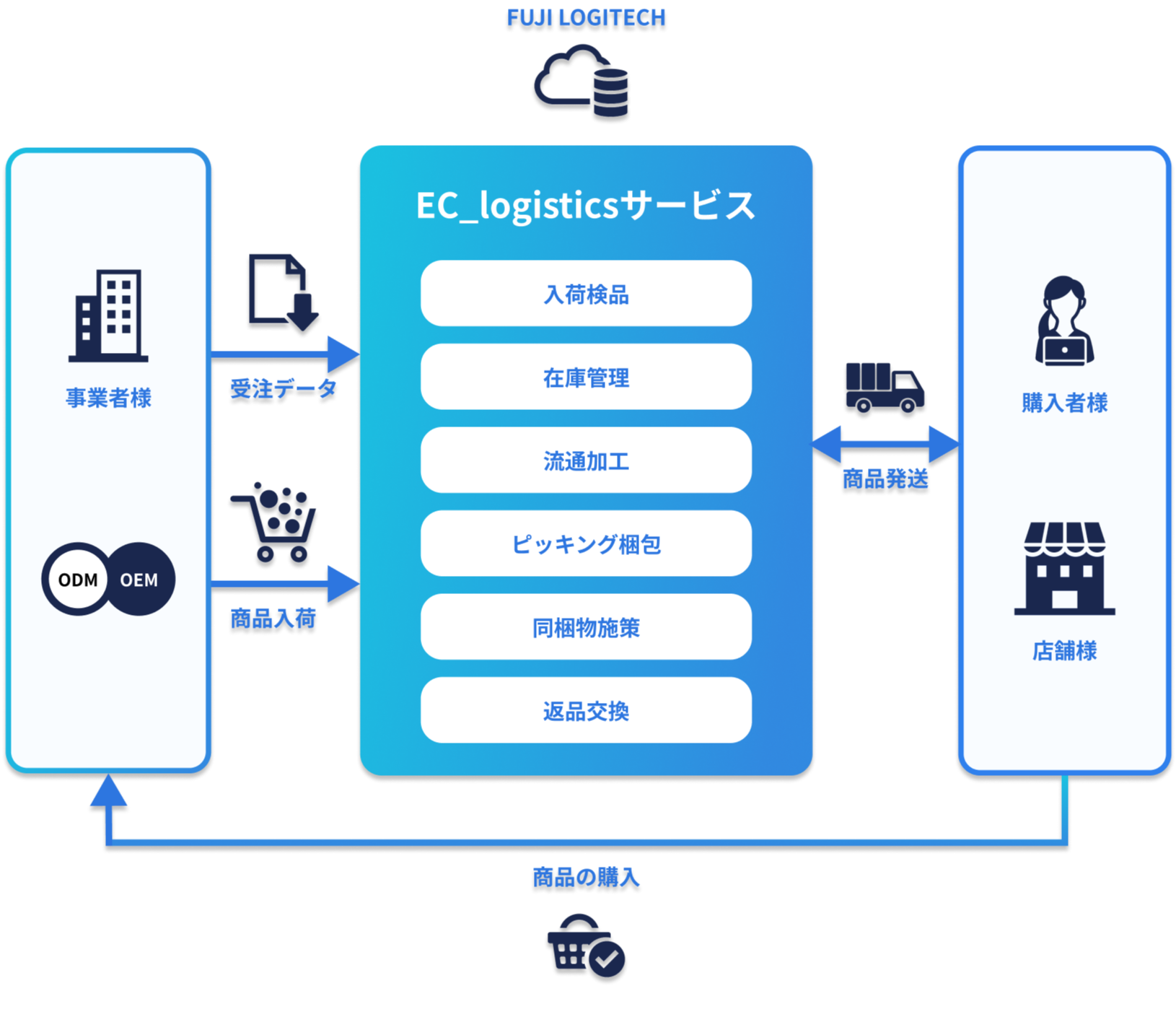 富士ロジテックホールディングスが、創業100年以上にわたる豊富な経験と実績にもとづき、商品の在庫管理から梱包や発送まで全ての作業を代行します。入出荷、保管在庫管理、検品からB2C/B2B物流まで、物流・発送業務のアウトソーシングが可能。EC担当者さまには本来の販売業務に専念していただけます。