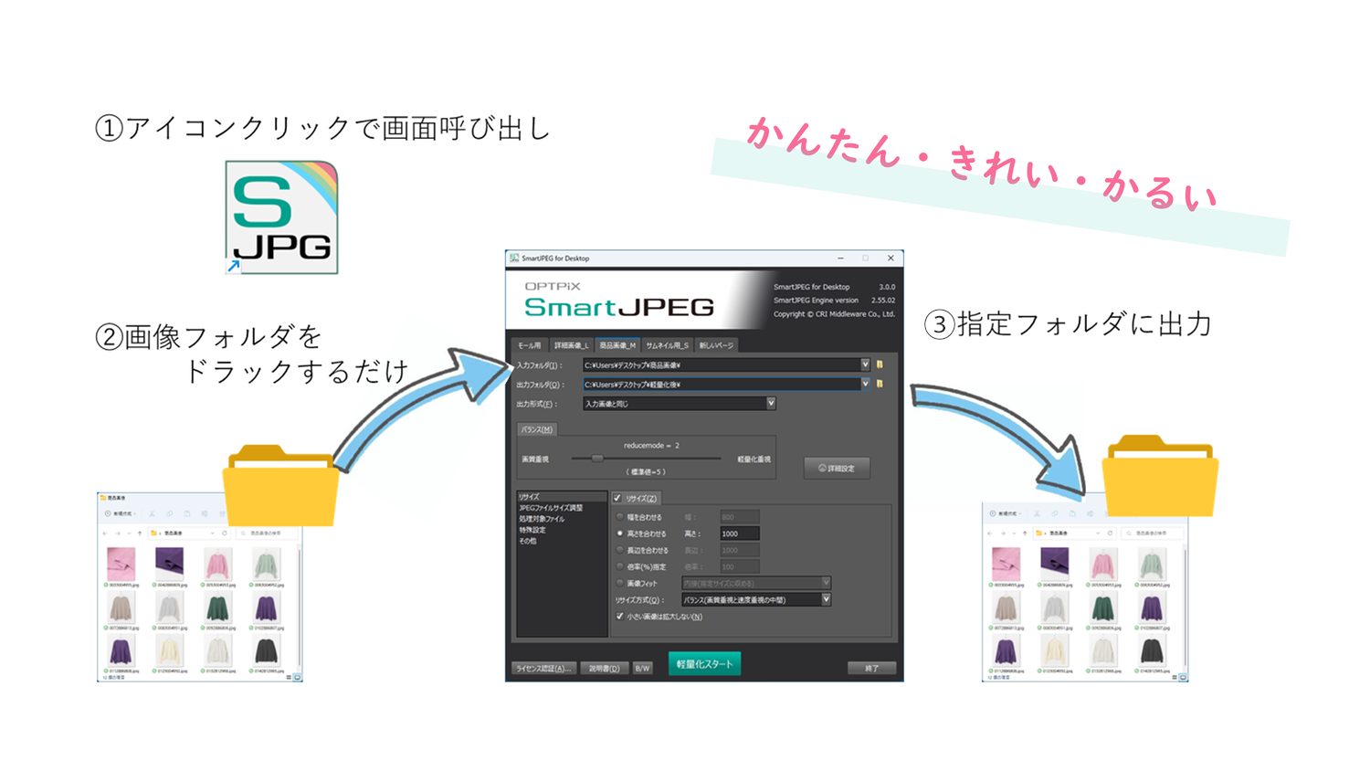 簡単な操作でフォルダ内の画像を一気に軽量化することができるだけでなく、リサイズ・ファイル名修飾・EXIF情報(撮影情報)削除など、ECサイト運用に必要な画像処理も「SmartJPEG for Desktop」で実行可能。4〜5時間かかっていた作業が、導入後には30分程度になったという事例もあり、ECサイト運用の効率化に寄与します。