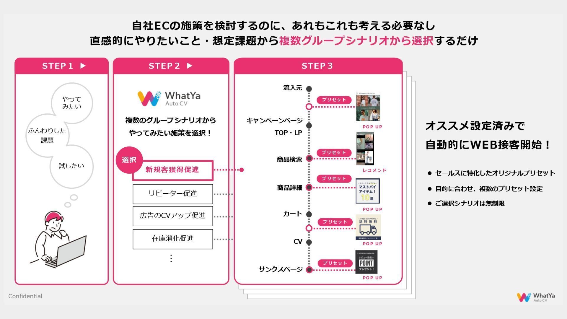 WhatYa Auto CV(ワチャオートコンバージョン)とは、自社EC店舗のCVRを自動的に向上させるWEB接客ツールです。カスタマージャーニーのあらゆるシーンで活用可能な「プリセット※」施策を豊富に備え、EC店舗への来店顧客を確実にコンバージョンに導きます。