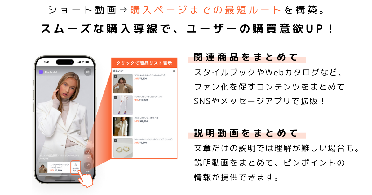 〜 高画質な動画をスピーディに読み込み。商品バナーを挿入できるなど、ECサイトに特化したショート動画で滞在率・CVアップへ 〜