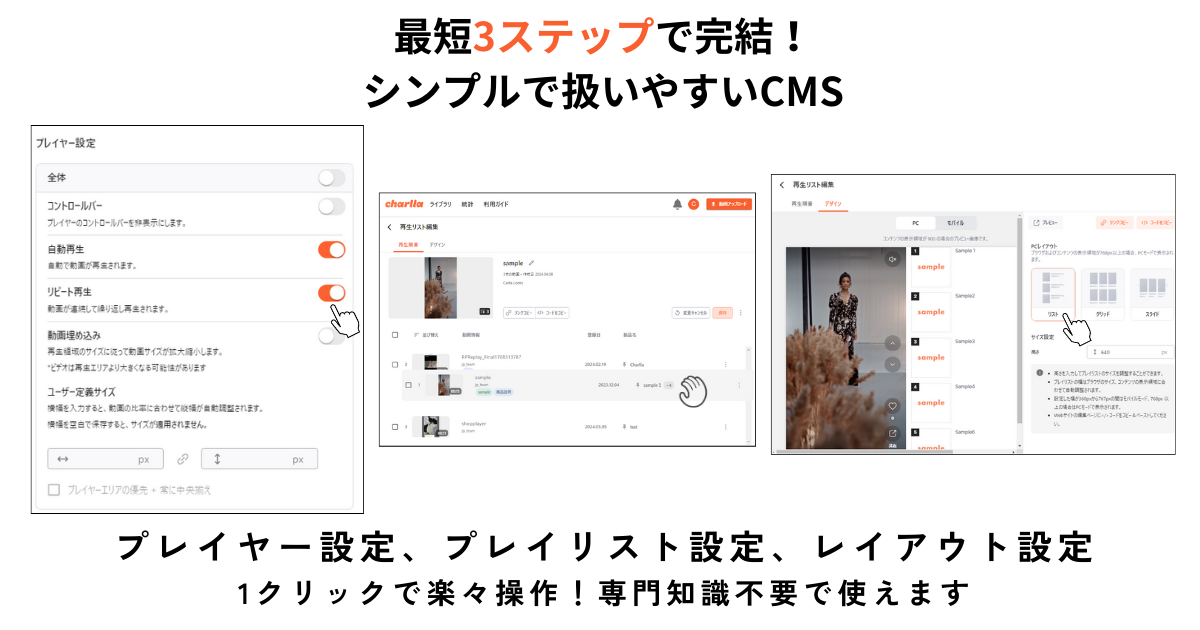 動画挿入タグの発行、プレイリスト作成、プレイリストのレイアウト変更など、ショート動画の運用に必要な各種プレイヤー設定が最短3ステップで完結できます。1クリックの簡易操作なので専門知識がなくても手軽に扱うことができます。