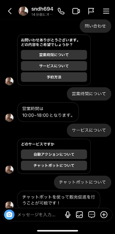 チャットボットがDMを自動返信。問い合わせへの回答やクーポン画像の送付なども自動化可能