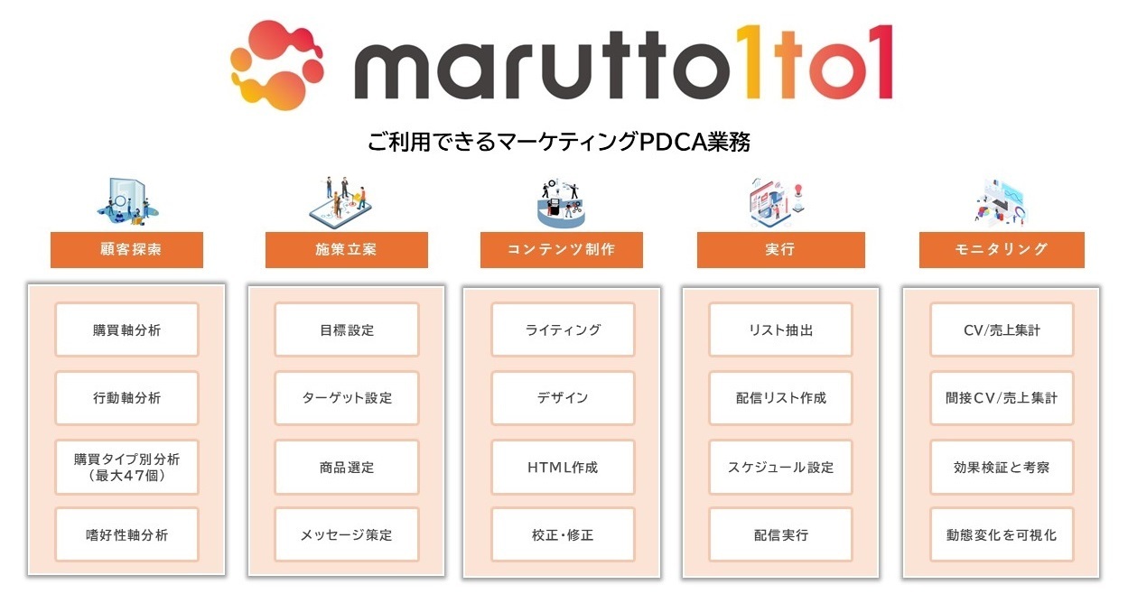 「marutto1to1」は、1to1マーケティング施策の最適化を一括代行するサービスです。