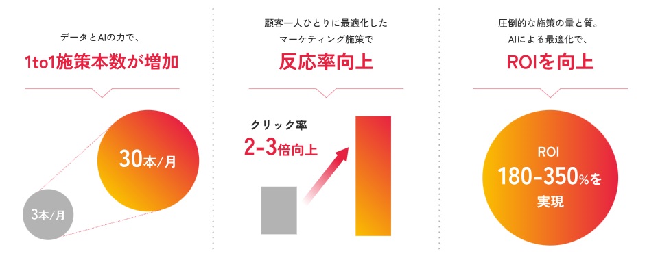 顧客分析や施策の立案からクリエイティブ制作、さらに改善予測まで、専門的な知識とリソースを活用して効果的な施策をスピーディに実現します。