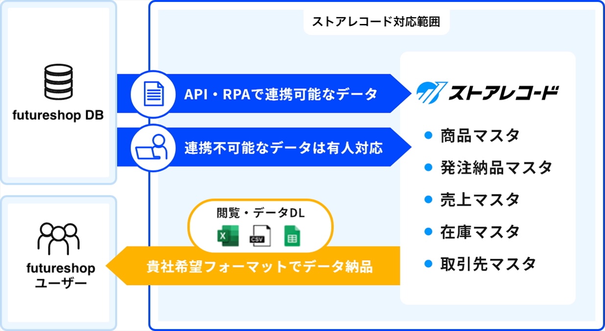 今回の連携により「futureshop」または「futureshop omni-channel」(以下「futureshop」)をご利用中のEC事業者さまは、「ストアレコード」のご活用により、売上・費用・仕入・在庫といったデータを一元管理できるようになり、経営上の重要な意思決定を迅速かつ精度高く行うことが可能になります。