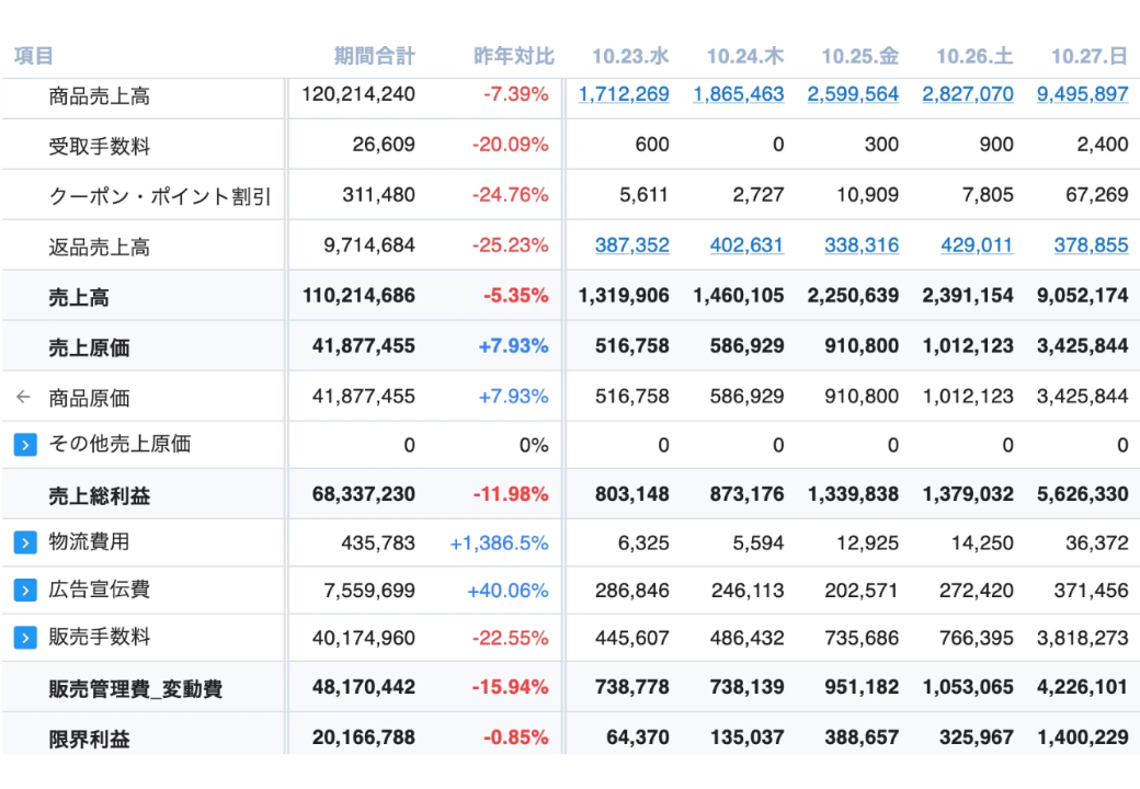 売上・費用・仕入・在庫のデータを自動的に収集・統合し、日々の限界利益を即座に算出します。複雑な集計作業がなくなり、広告投資や販促活動に関する意思決定がスピーディかつ正確に実現可能です。
